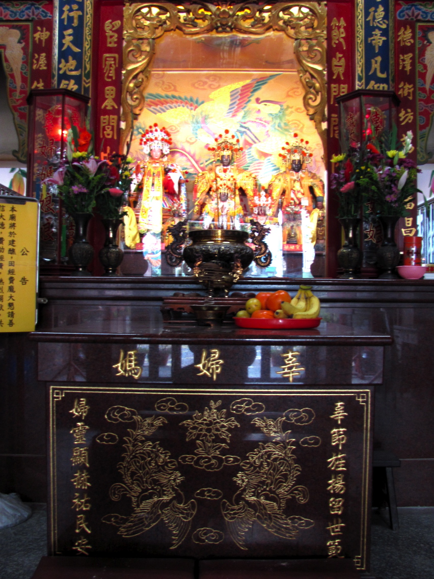 One of wonders of Tainan is how no matter what alley you walk down, you’ll run into a temple. One day, I cut down an alley about a block away from the City God Temple and came across a mysterious (to me) little temple. Dedicated to Gu Fuma (辜婦媽) – Mother Gu, statues of three women sat on the main altar.