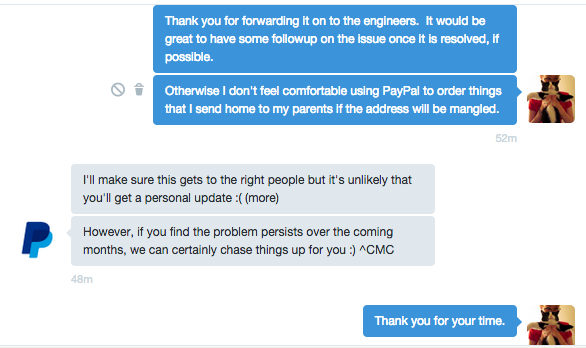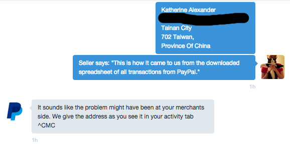 They looked into the issue where the Taiwanese address I gave them was passed on to the seller with “Province of China” appended. They will forward it on to the software engineers behind the scenes. It’s not a high priority, but will get looked at in time. They can’t tell me when it will be fixed, but encourage me to continue sending packages to Taiwan through PayPal and to let them know if it happens again. (see below for a transcript)