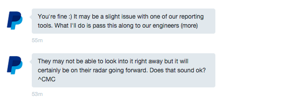 PayPal customer service (@AskPayPal) and I had a conversation this morning via direct messages on Twitter. I appreciate their prompt response.
