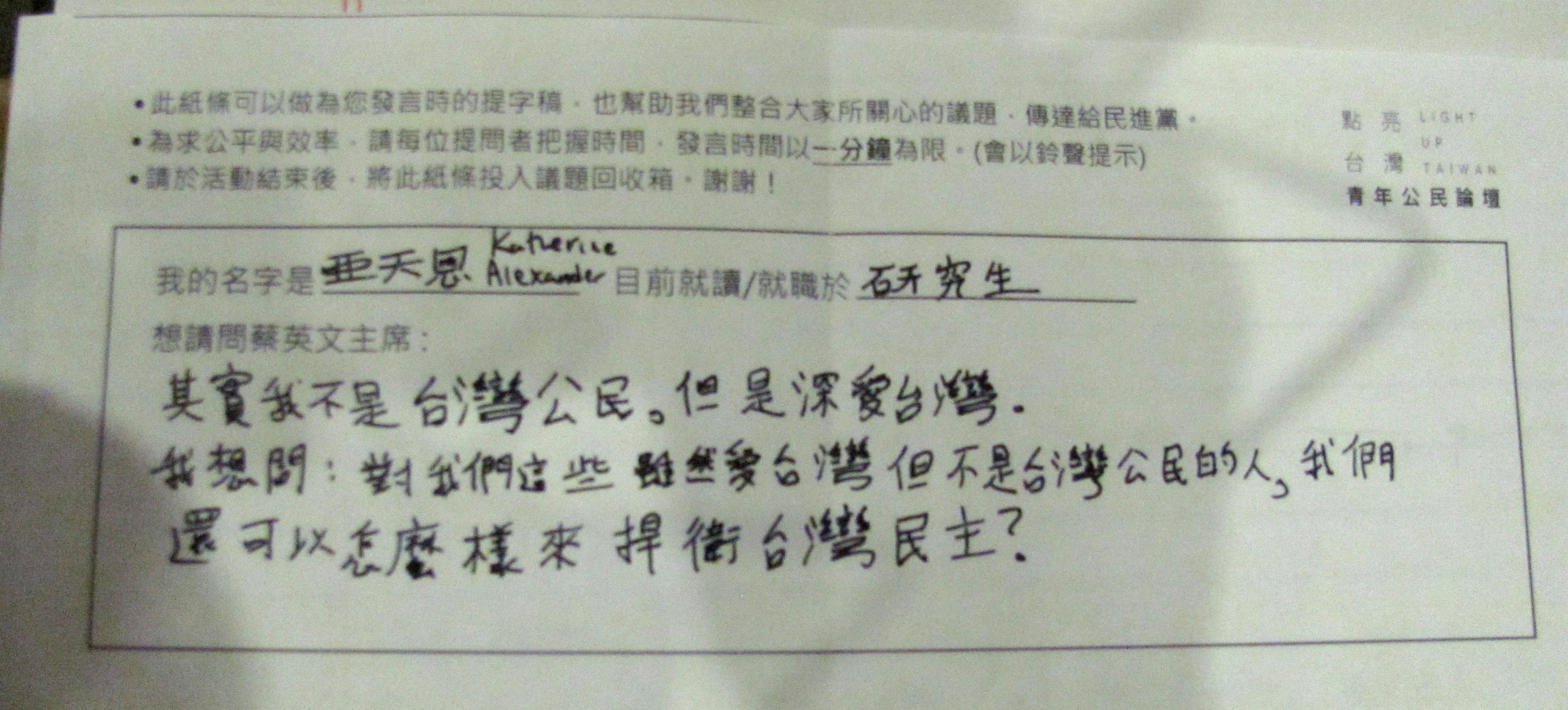 I can’t vote in Taiwan, so I made no effort line up with the questioners. The event was for Taiwanese, not for interlopers like me, so I contented myself with taking notes and feeling thankful for being included.