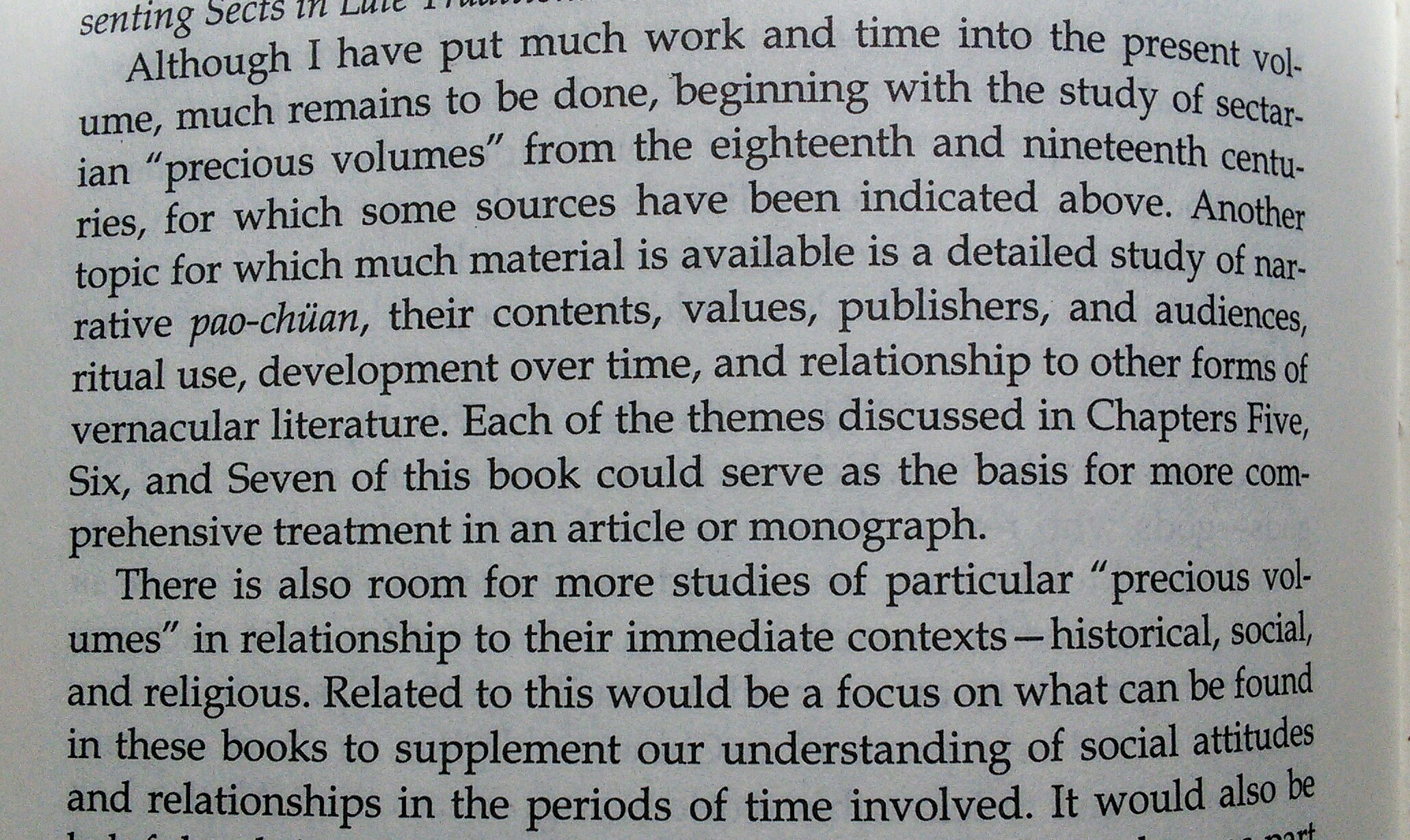 and more directly related to my dissertation, two sections from the book that started it all for me, really: Precious Volumes: An Introduction to Chinese Sectarian Scriptures from the Sixteenth and Seventeenth Centuries by Daniel Overmyer, published in 1999.