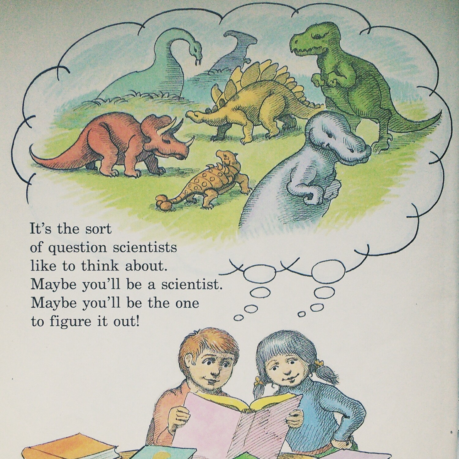 First, a much beloved book (now mostly scientifically inaccurate, but still beloved) from my childhood called The Day of the Dinosaur by Stan & Jan Berenstain which ends with: